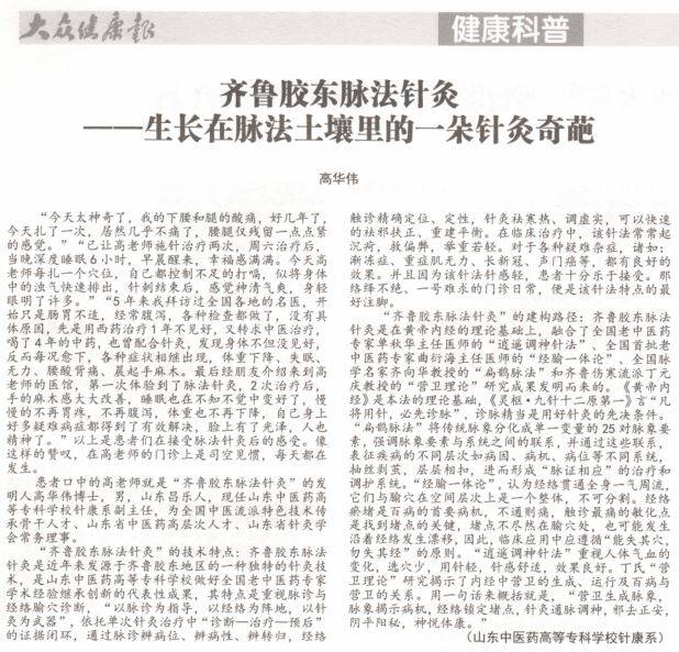 5月22日,《大众健康报》,建国后首批创刊的健康类科普报纸,对我校高华伟副教授发明的“齐鲁胶东脉法针灸”进行了报道,见下图: