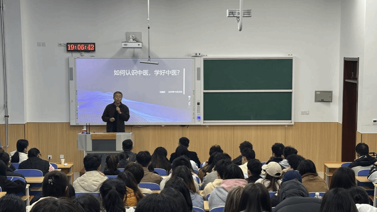 讲座面向传承班与普通班级学生同步开放,体现了学校在推动优质教学资源共建共享方面的积极探索。讲座中,马晓彤教授从中医的知识属性、中医的价值、中医的理论基础和实践要旨等方面出发,结合《黄帝内经》等经典,运用深入浅出的比喻和示例,系统解读了“八纲辨证”“脏腑经络”等核心概念,为学生构建了完整的中医认知框架。