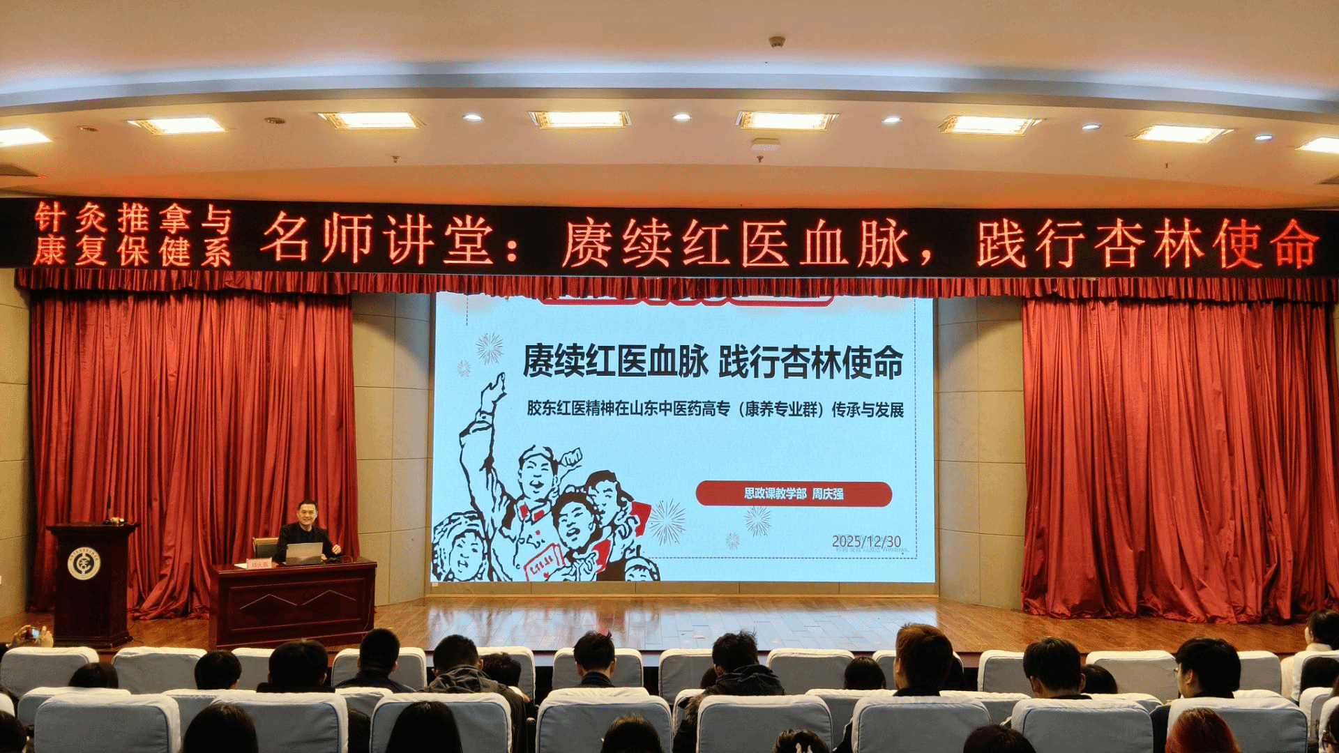 讲座以“赓续红医血脉,践行杏林使命——胶东红医精神在山东中医药高专(康养专业群)传承与发展”为主题,从胶东红医精神的起源与内涵、胶东红医人物的鲜活形象、针康学子践行精神新篇章三个维度展开,深入浅出情理交融。周庆强结合大量珍贵历史照片与真实案例,生动还原了战争年代胶东前线医疗队在极端艰苦条件下救死扶伤、服务人民的英勇场景,深刻阐释了“对党忠诚、一心为民、无私奉献、中西汇通、艰苦奋斗”的红医精神内核。他特别讲述了我校老一辈中医大家曲衍海、柳吉忱等先生如何将红医信仰融入岐黄之道,在烽火岁月中守护生命、传承医道,彰显了山东中医药高专与红医精神的深厚渊源。周庆强还结合针灸推拿、康复等专业特点分析“红医精神”在当代医疗服务中的实践路径,强调新时代针康学子既要筑牢忠诚之魂,又要锤炼过硬之技,秉持医德仁爱之心,在红医精神照耀下,学业有成、不负韶华,成为优秀中医药传承者和实践者。