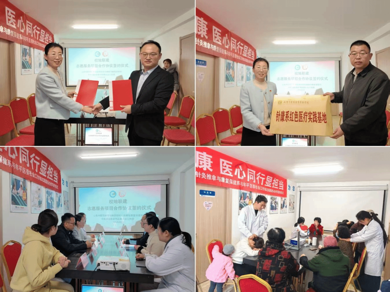 活动现场,针康系党总支书记徐迎涛、牟平区委社会工作部代表分别致辞,围绕“资源共享、优势互补、服务群众、协同育人”的目标,明确双方长效合作机制。区委社会工作部发挥统筹协调作用,搭建社区服务载体;针康系依托针灸推拿、康复保健专业优势,以新建实践基地为依托,共同推动志愿服务常态化、规范化开展。双方将在宁海、武宁街道多个社区定期组织康复指导、中医理疗、健康科普等服务,着力打造群众家门口的常态化健康服务品牌,让便民服务更有温度、更具持续性。