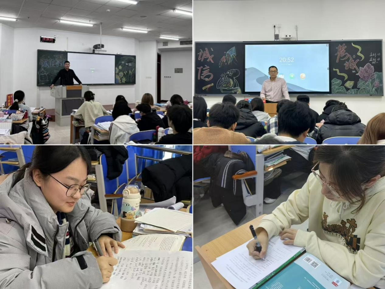 主题教育活动共分为三个环节。一是各班级辅导员解读了学校关于考试的各项规章制度和纪律要求,通过摆事实、讲道理等方式强调诚信考试的重要性,勉励学生诚信考试,诚信做人;二是学生签署诚信考试承诺书,郑重承诺将严格遵守考试纪律,拒绝作弊行为,共同营造风清气正的考试环境,进一步强化诚信意识和责任意识;三是学生讨论交发言,表示将以实际行动践行诚信考试的承诺,自觉遵守考场纪律,坚决抵制任何形式的作弊行为。