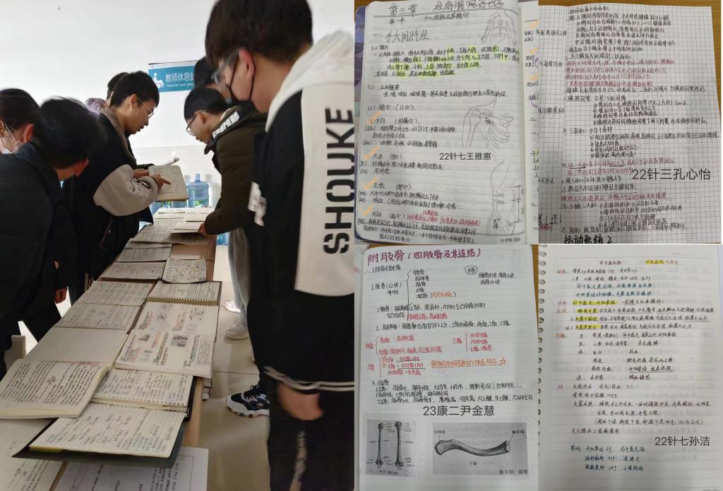 本次活动共展示了一百余名学生的学习笔记,这些学习笔记有的简洁工整、字体娟秀,有的图文并茂、生动形象。学生利用自画插图、便签、注释、思维导图等方法,将任课教师的授课内容、重点难点做了清晰的记录,形成知识体系。展现出针康学子严谨认真的学习态度和踏实上进的优良学风。经评比22针七王雅惠、23针二张子涵、22针三孔心怡等十名学生获得一等奖。
