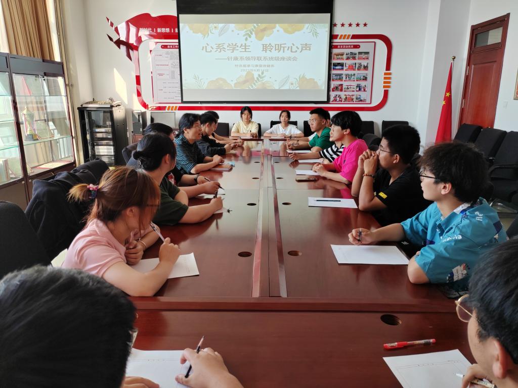 为持续践行主题教育总要求,紧密围绕“立德树人”中心任务,针康系党总支积极作为、真抓实干、聚焦问题、知难而进,以“时时放心不下”的责任感与“事事为学生着想”的担当性着力解决学生实际问题,力争在“以学铸魂”、“以学正风”、“以行促能”等方面取得实实在在的育人成效。根据学校部署安排,6月14日下午,针康系在综合楼11楼会议室召开了以“心系学生 聆听心声”为主题的领导联系班级座谈会,系部党总支书记张琳琳、部分辅导员与来自22针推5班的15名学生代表进行了座谈,广泛听取学生的意见与建议。