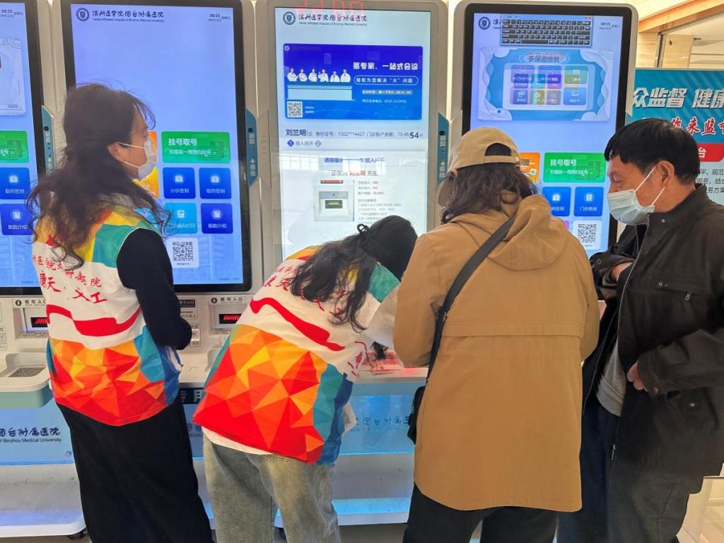 4月21日,针康系“红色医心”志愿服务队赴滨州医学院烟台附属医院,开展“健康天使,温暖人心”志愿活动,协助患者使用自助机,优化就医流程,提升服务效率。