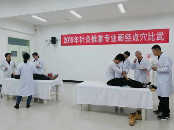本次比武于4日晚在针推实训中心举行,由针灸教研室主任辛铭金教授主持,针灸教研室派出任课教师担任评委。吕美珍副主任全程观摩指导。参赛选手来自2018级针灸推拿专业7个班级,经班内初选,共选拔出20名选手。比武分画经和点穴两个环节,每位选手随机抽取十二正经中的任意一条经脉,边用《灵枢经》原文描述,边画经。之后用最合理的腧穴定位法定取抽到的五个腧穴。