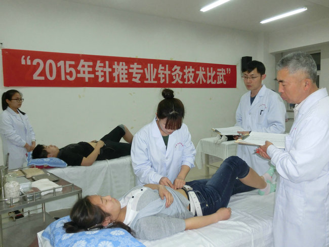 针康系在针灸实训室举行了针灸推拿技术比武, 13高针6个班共48名选手参赛,针灸推拿教研室派出骨干教师担任评委,系武永刚主任、吕美珍副主任观摩指导。