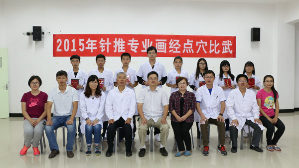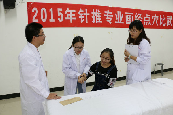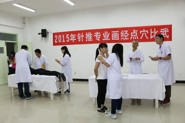 为贯彻落实“以赛促练”、“以赛促学”的教学模式,进一步调动同学们的学习积极性,夯实技能素养的基础,6日晚自习,针康系在2号实验楼针推实训中心举办了2015年画经点穴比武。针灸推拿教研室分别派出任课教师担任评委,针康系武永刚主任、吕美珍副主任全程观摩。