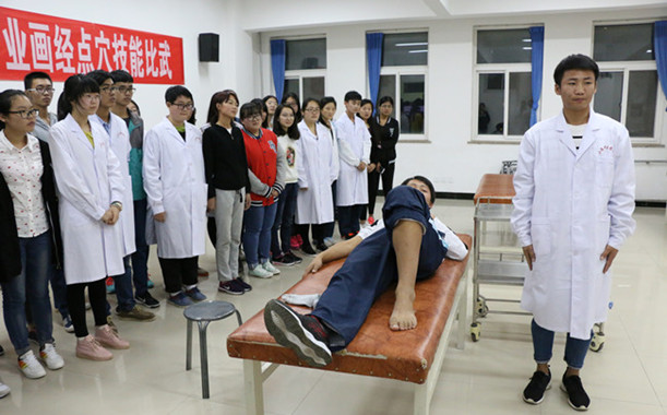 参考全国的赛事流程,充分体现公平性,专业负责人吕美珍副主任对本次比赛进行了流程的规范处理——唐妮讲师和实验员辛书超负责选手进场安排;赛程分为画经和点穴两个部分,分别由针灸教研室主任辛铭金教授、高华伟讲师担任画经评委,景政讲师和王志磊讲师担任点穴评委,每位选手从12个信封中随机抽取自己的题目,分别画经、点穴,其最终成绩为四位评委老师的打分总和。王晓燕讲师和赵菲讲师负责统分。经过有序而激烈的角逐,最终2015级高针6班获得团体一等奖,2015级高针4班获得团体二等奖,2015级高针1班和5班获得团体三等奖;高可可、纪秋如获得个人一等奖,王婷、石运来、徐湘杰、曹龙、梁爽、苑玉坤获得个人二等奖,米帅帅、郭丛丛、吴凡、姜倩、苗莹、周美玲、翟钰泽、苑晓丽获得个人三等奖。赛后,辛铭金教授和景政讲师分别就画经和点穴进行了点评,之后参加全国比赛并获二等奖的王尊帅同学为本次比武选手进行画经点穴示范,让在校同学近距离观摩全国大赛的流程和水准,找到差距,鼓足干劲继续努力。