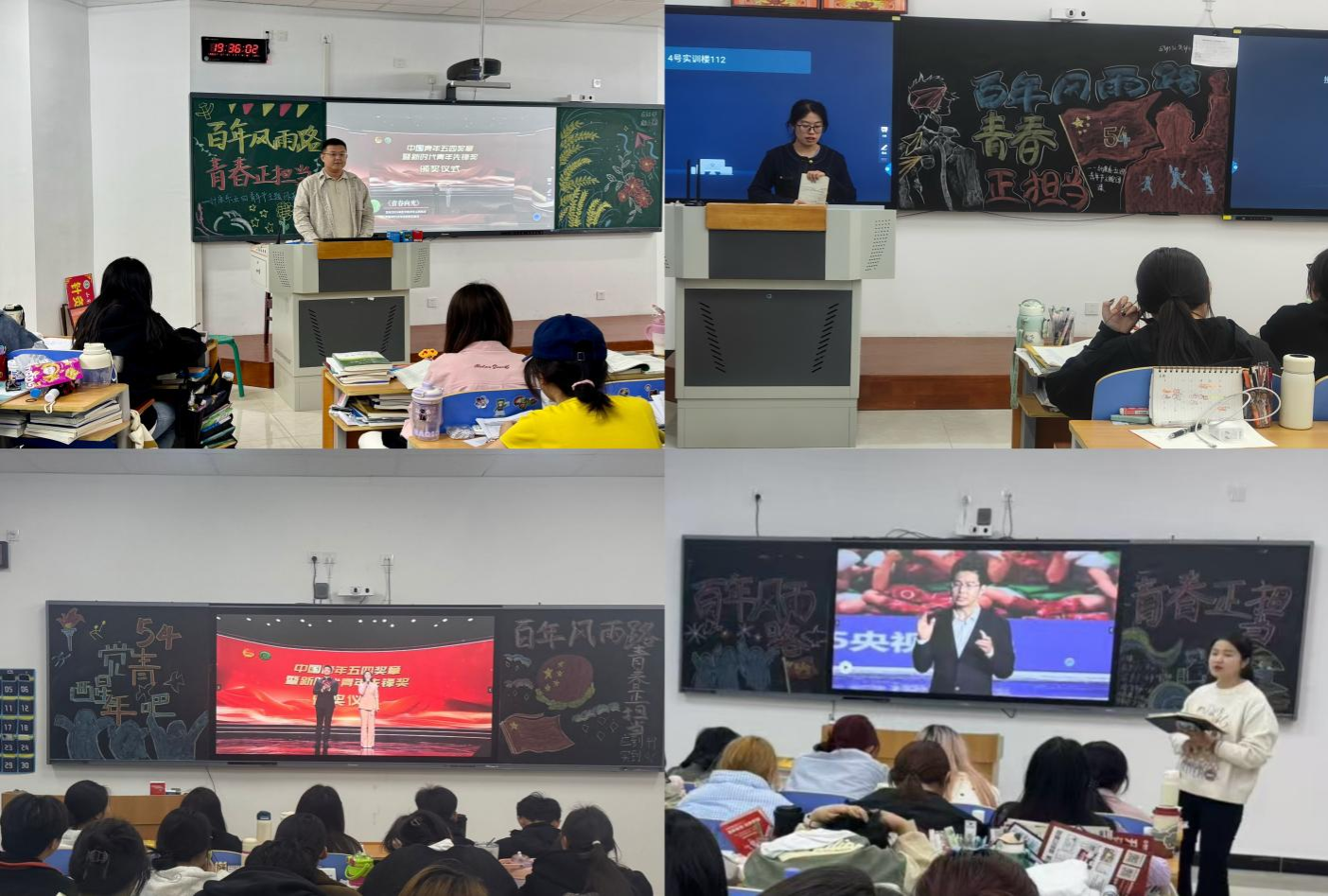 团课伊始,全体师生共同观看了《五四记忆》专题纪录片。影片以珍贵的历史影像资料,生动再现了1919年那段激情燃烧的岁月。观影过程中,同学们神情专注,不时报以激奋的掌声。同时,组织学生们观看《中国青年五四奖章暨新时代青年先锋奖颁奖仪式》,使同学们深入了解新时代青年先锋榜样在科技创新、乡村振兴、绿色发展、社会服务、卫国戍边等各领域各方面争当排头兵和生力军的事迹。最后辅导员领学了习近平给谢依特小学戍边支教西部计划志愿者服务队队员的回信内容,并结合我校优秀毕业生、西部计划志愿者“沙海小郎中”艾乐松的事迹进行互动讨论,鼓励学生们到基层去、到西部去、到祖国需要的地方去。